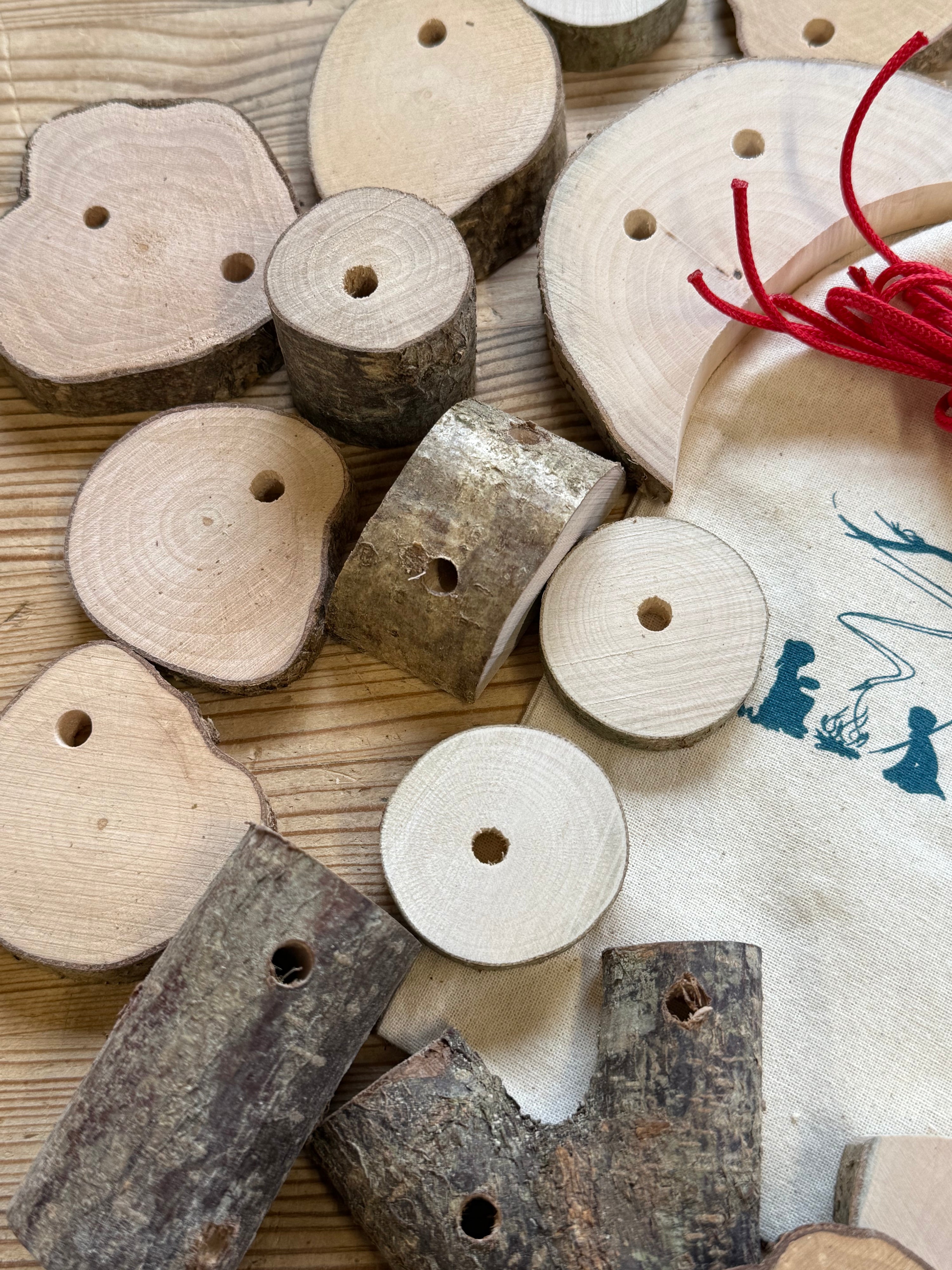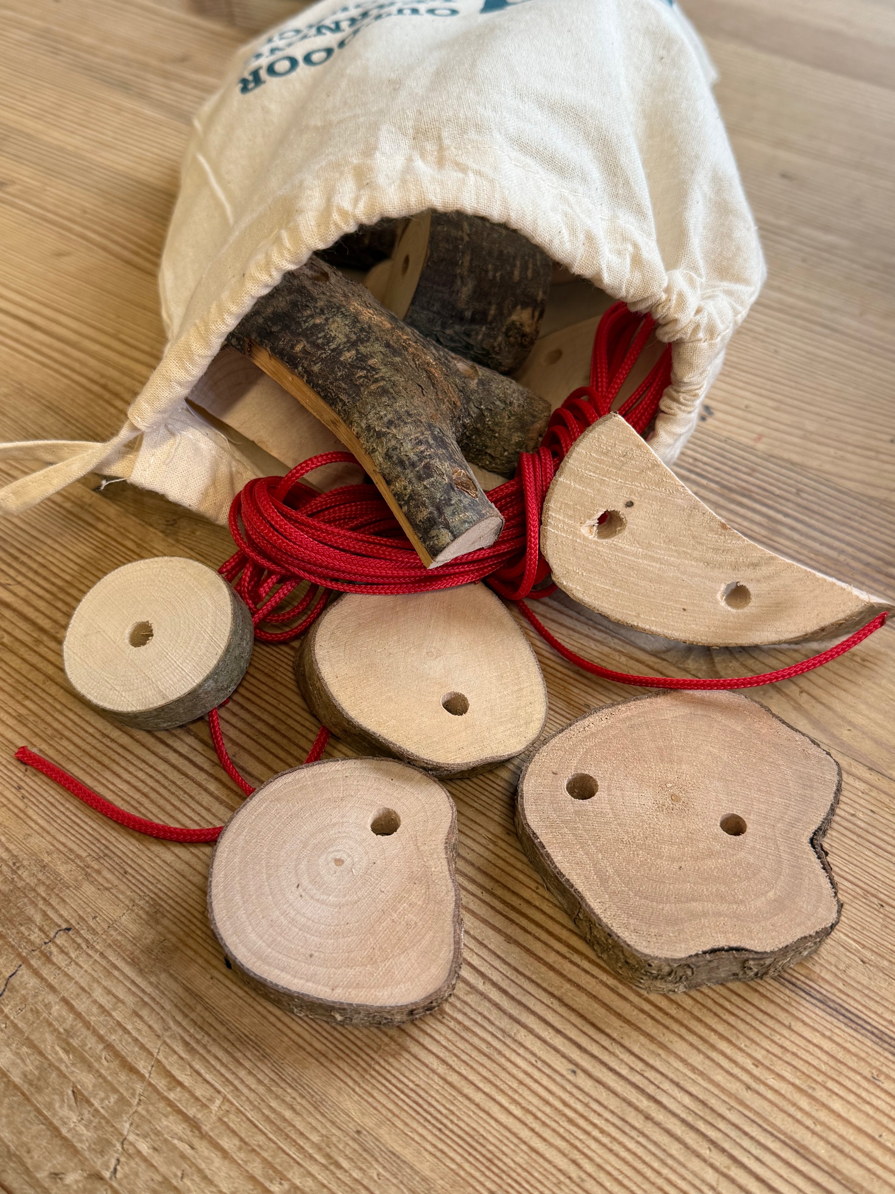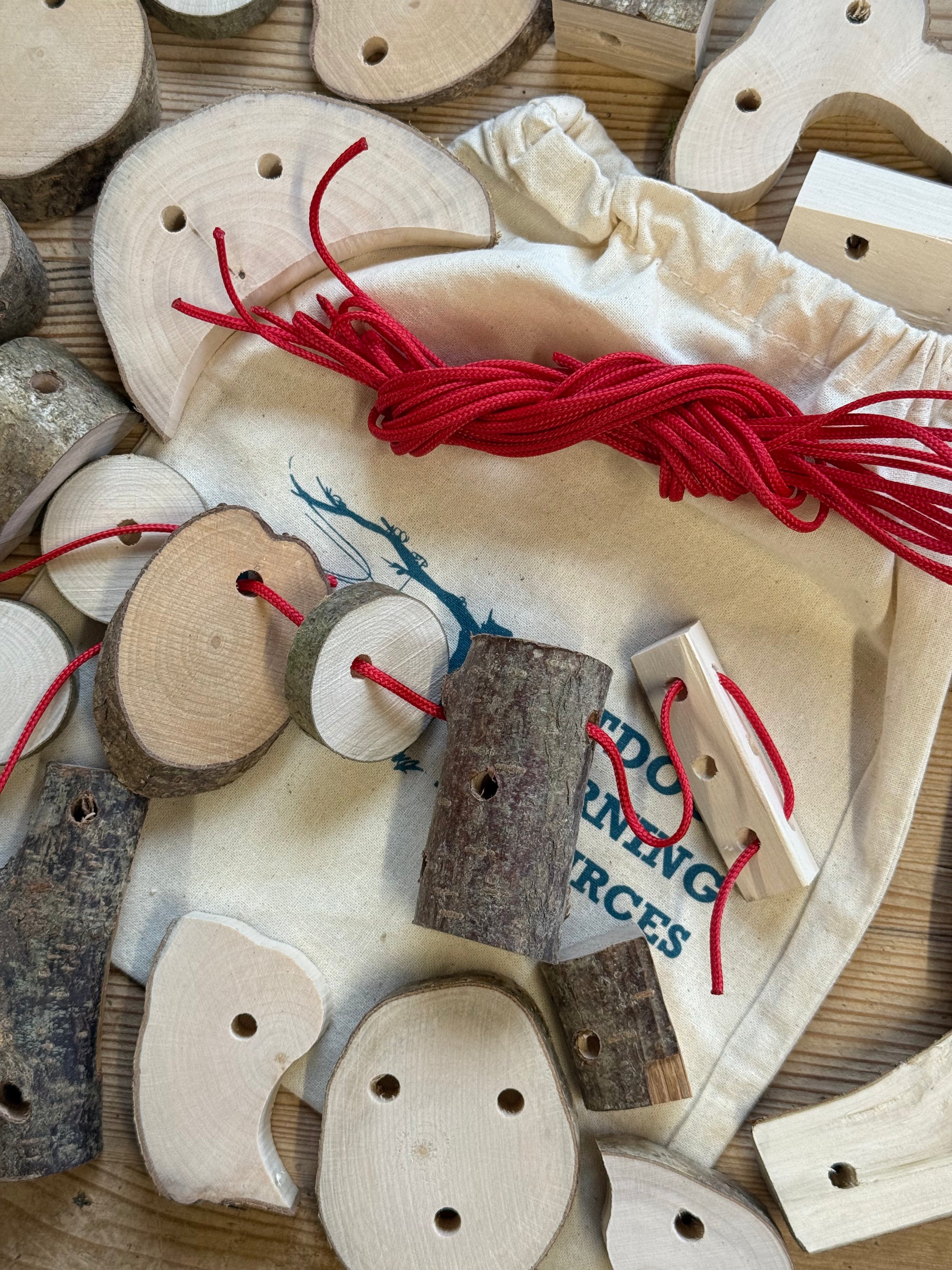 This children's natural threading set contains 30 drilled assorted pieces of sustainably sourced and hand cut wood, with 6 lengths of 2mm braided cord ranging in length from 50 to 150cm.